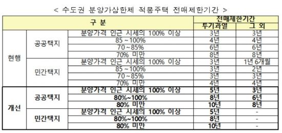 이날 국무회의를 통과한 주택법 시행령 개정안은 분양가 상한제 적용 지역 요건을 '3개월간 주택가격 상승률이 물가 상승률의 2배 초과한 지역' 등에서 '투기과열지구로 지정된 지역'으로 확대하고 분양가 상한제 적용 아파트의 전매제한을 최대 10년으로 늘리는 게 주요 내용이다. 분양가상한제를 통해 저렴한 아파트를 살 경우 시세차가 클 수록 더 오랫동안 되팔지 못하게 제한을 두는 방식이다. 이에 따라 향후 분양가 상한제가 적용되는 민간아파트의 분양가가 인근지역 주택매매가격의 100% 이상이면 전매제한 기간이 5년이지만, 시세반영률이 80% 이상 100% 미만인 경우 전매제한 기간은 8년, 시세반영률이 80% 이하일 경우 10년으로 강화됐다.