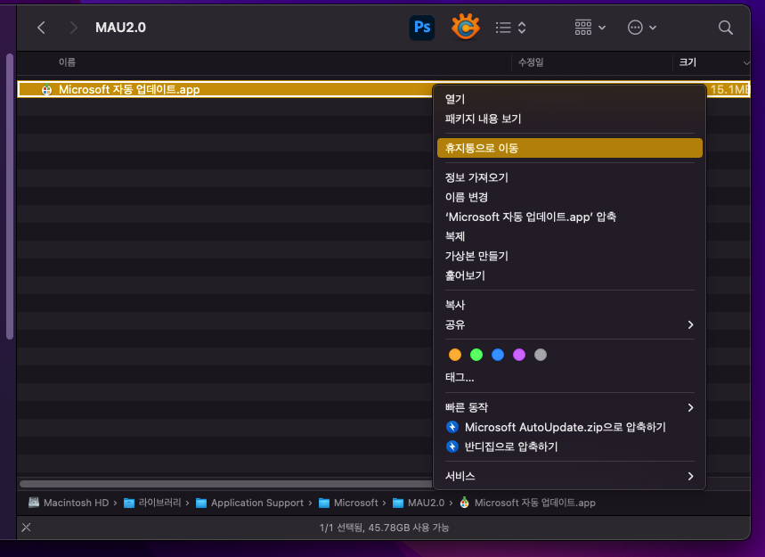 폴더를 찾아 들어가면 "Microsoft 자동 업데이트.app"를 삭제한다.
