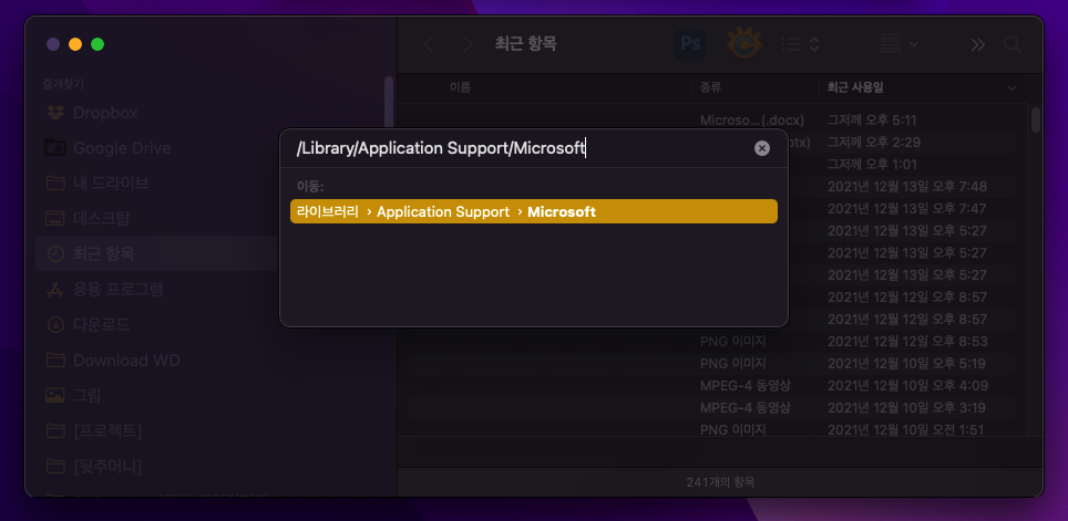 1. MacOS의 Finder에서 폴더로 이동(Command + Shift + G)을 누르고 아래 경로를 입력한다.