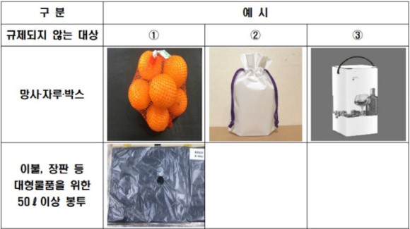 대형마트 등 대규모점포 2000여곳과 165㎡ 이상 슈퍼마켓 1만1000여곳이 대상으로 이들 1만3000여개 매장에서는 일회용 봉투 및 쇼핑백을 사용할 수 없습니다. 제공하다 적발되면 위반 횟수에 따라 최대 300만원까지 과태료가 부과됩니다. 대규모점포 및 슈퍼마켓에 입점한 모든 업체가 규제 대상이며 점포 내 입점한 임대업체가 규정을 어겼을 경우엔 입점 업체를 관리·운영하는 주체에게 과태료가 부과됩니다.