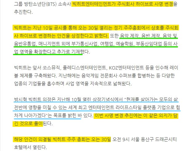 빅히트 엔터는 10일 공시를 통해 회사명을 '빅히트'에서 '하이브'로 변경 안건을 상정하였음을 밝혔는데 사업을 더 다양한 분야로 확장하기 위해 사명을 하이브로 변경하고 빅히트는 레이블로 남을 듯싶다.