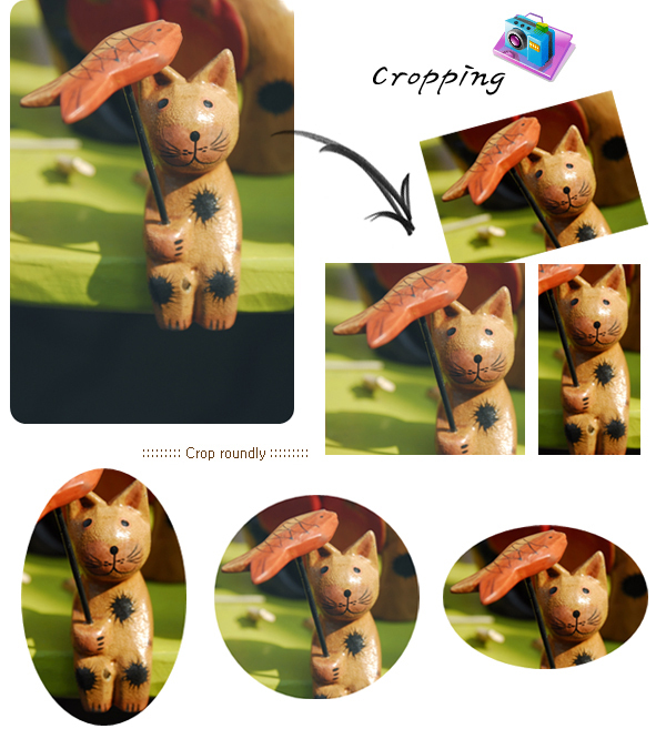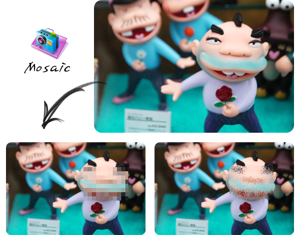 -사진편집: 크기/밝기/색상 조절, 역광보정, 액자, 말풍선, 모자이크, 글쓰기, 그리기, 자르기, 필터, 적목보정, 뽀샤시, 복제도장툴