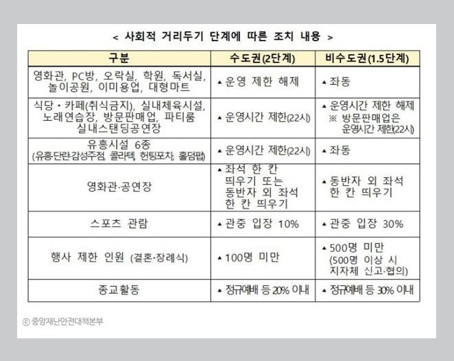 비수도권은 사회적 거리두기 1.5단계로 완화되면서 음식점 노래연습장 식당등 카페 6종 운영제한 해제 됩니다.