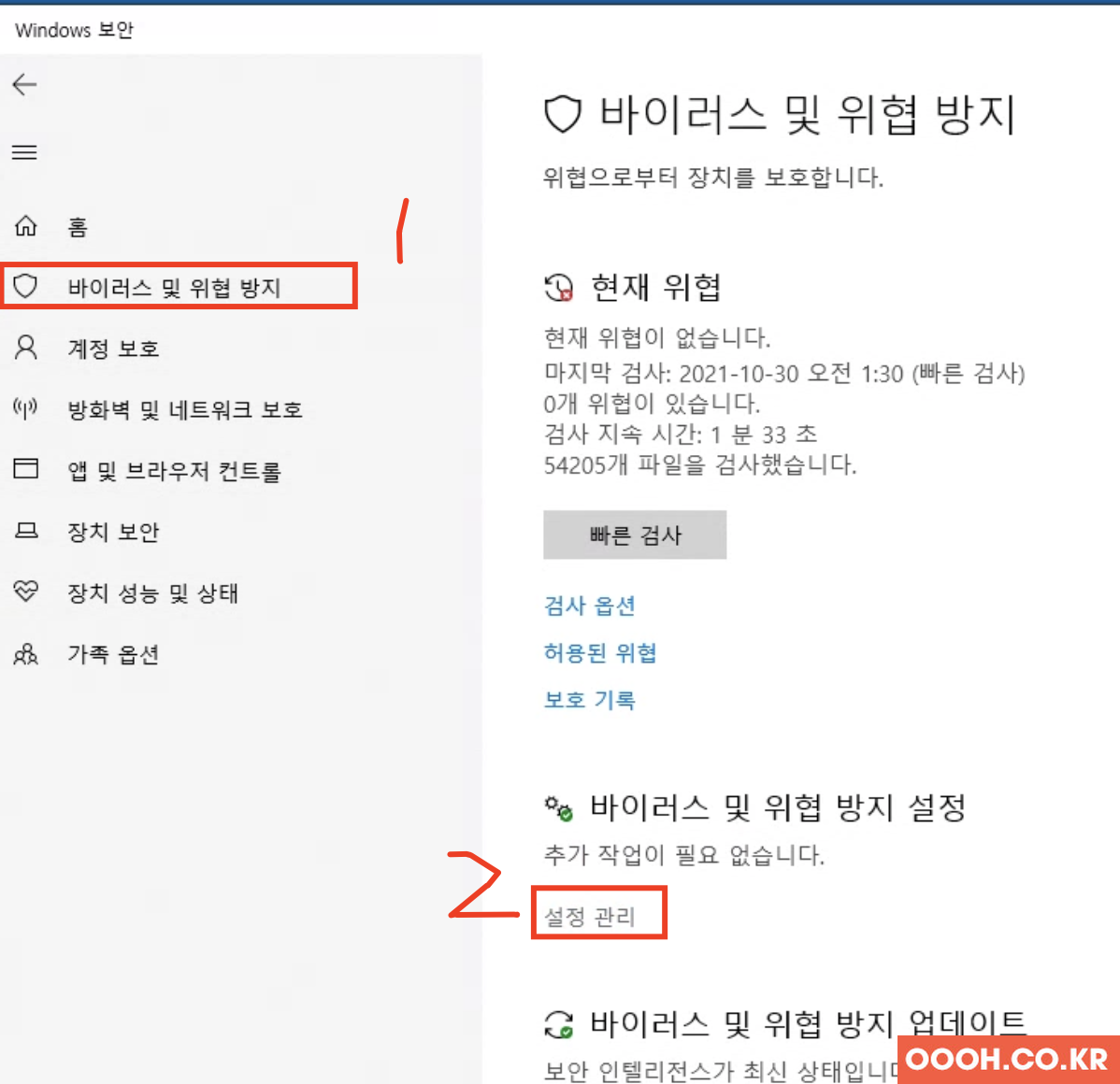 왼쪽에 [바이러스 및 위협 방지] 버튼을 누르고 [설정관리]를 누릅니다.