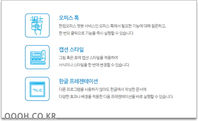 한컴오피스 챗봇 서비스인 오피스 톡에서 필요한 기능에 대해 질문하고,
