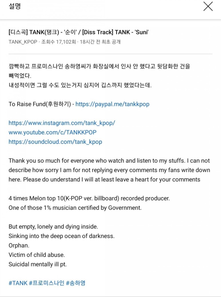 ‘[디스곡] TANK(탱크) - '순이' / [Diss Track] TANK - 'Suni'’ 제목의 게시물을 올렸다.