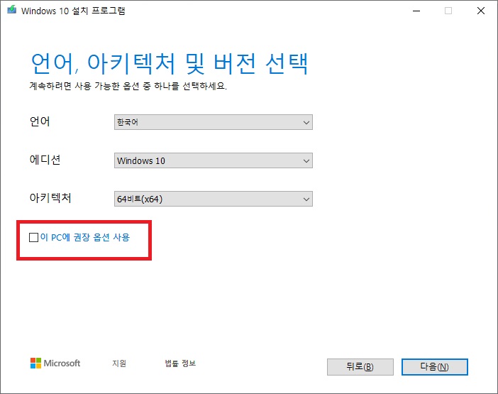 여기 조금 중요합니다. 여기에서 이 PC에 권장 옵션 사용을 체크하게 되면 여기서 만든 윈도우10 설치 USB를 다른 PC에서 사용을 못 할 가능성이 매우 높아지게 됩니다. 그래서 될 수 있는 데로 [이 PC에 권장 옵션 사용] 체크를 꼭 해제해 주시길 바라겠습니다.