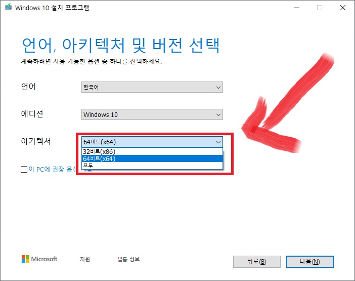 이제는 32비트 윈도 사용하시는 분이 거의 안 계시리라 생각이 되지만 그래도 혹시라도 32비트 사용하신다면 아키텍처를 바꿔주시면 되고요 내가 어떤 버전을 사용하는지 잘 모르겠다 혹은 상황에 따라 다른 걸 선택해야 한다고 생각하면 [모두]를 골라주시고 아니라면 64비트란 하셔도 괜찮습니다.