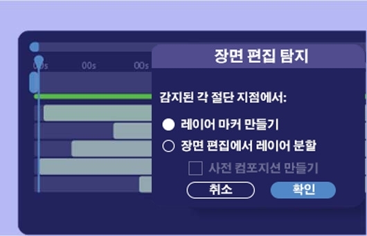 Adobe Sensei를 기반으로 편집된 클립에 있는 장면의 변화를 자동으로 감지하여 장면을 개별 레이어로 배치하거나 편집점에 마커를 만들어 주므로 프로젝트 설정 속도가 빨라집니다.