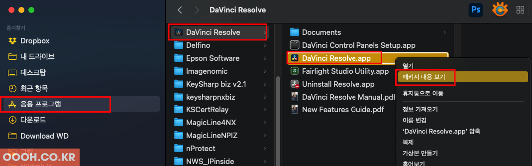 DaVinci Resolve.app > 패키지 내용 표시를 마우스 오른쪽 버튼으로 클릭합니다.