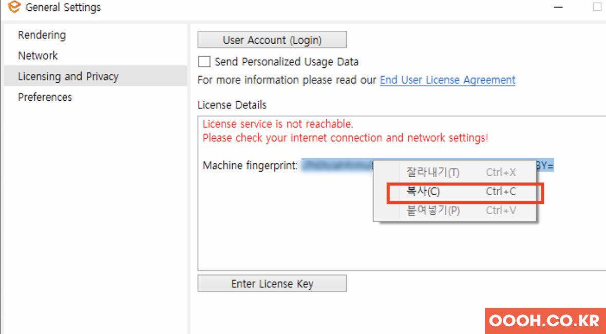 다시 스케치업으로 돌아와서 하단에 Enter License Key를 눌르고 나오는 창에 복사된 키를 붙여넣습니다.