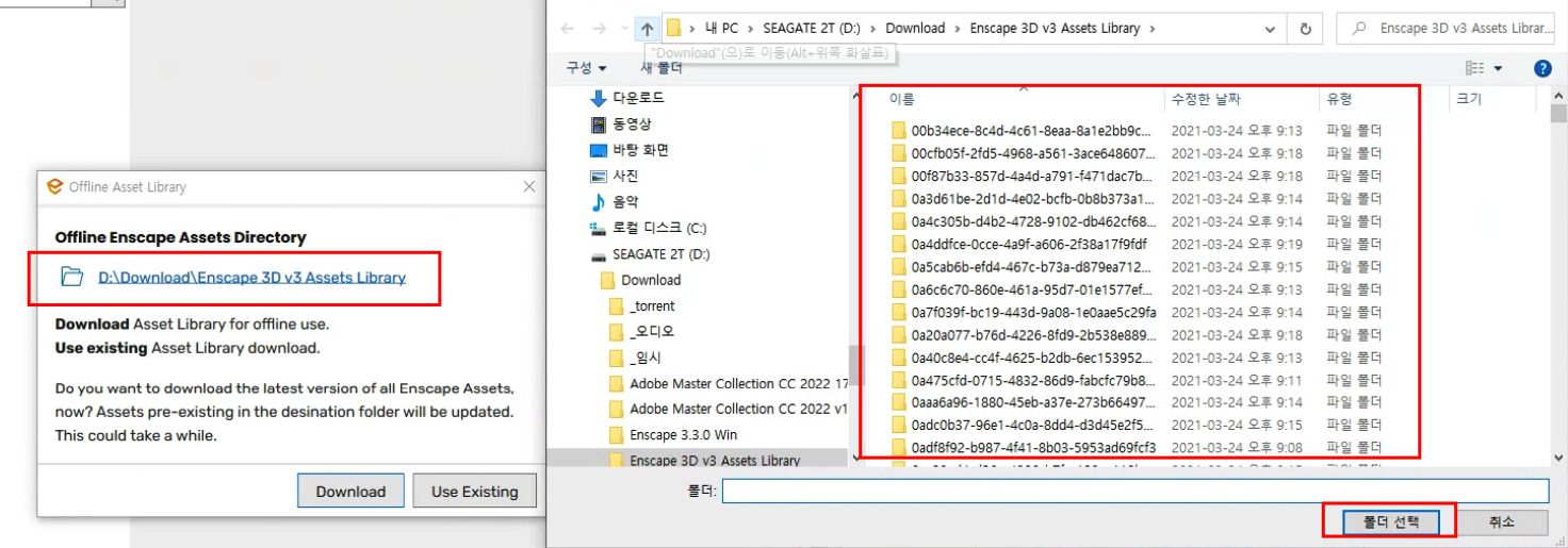 그 경로를 오프라인 에셋 디렉토리 연결을 설정합니다.