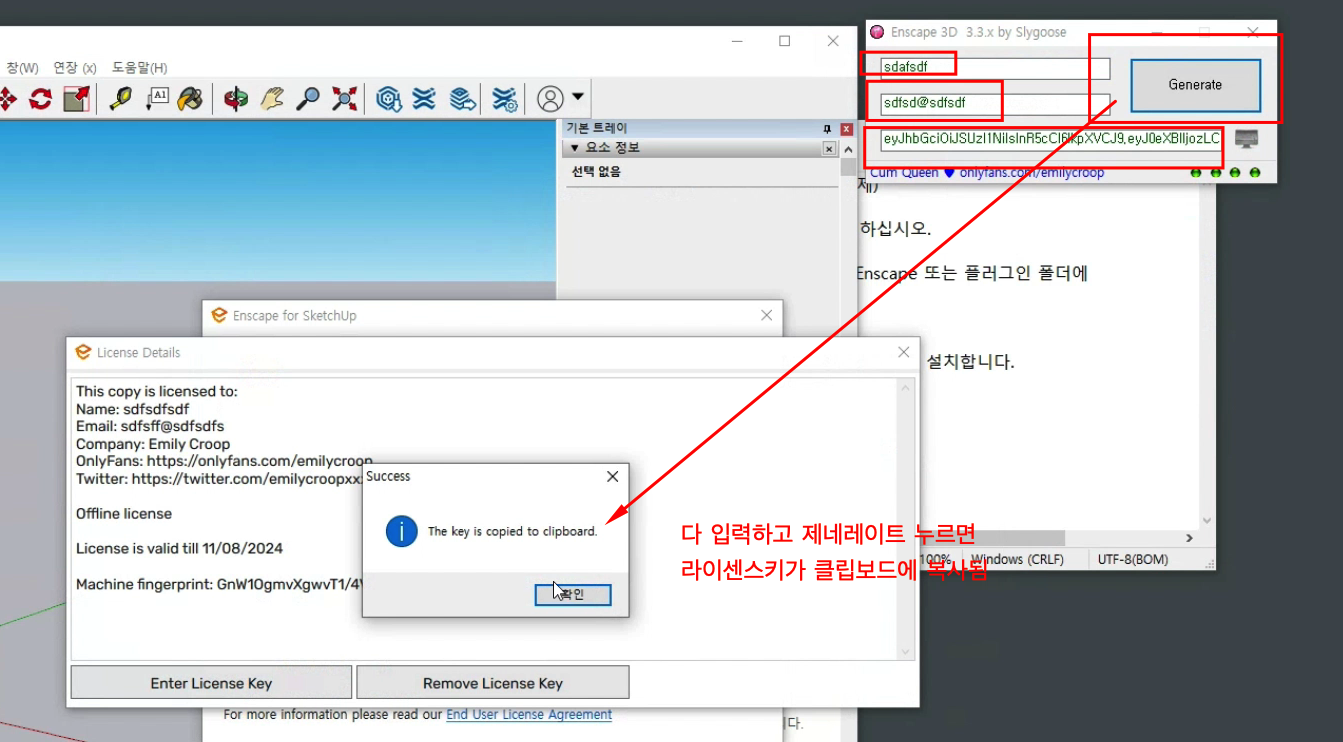 첫번재 두번째 칸 아무거나 입력해주고 [제네레이트] 버튼을 클릭하면 키가 복사가 된다