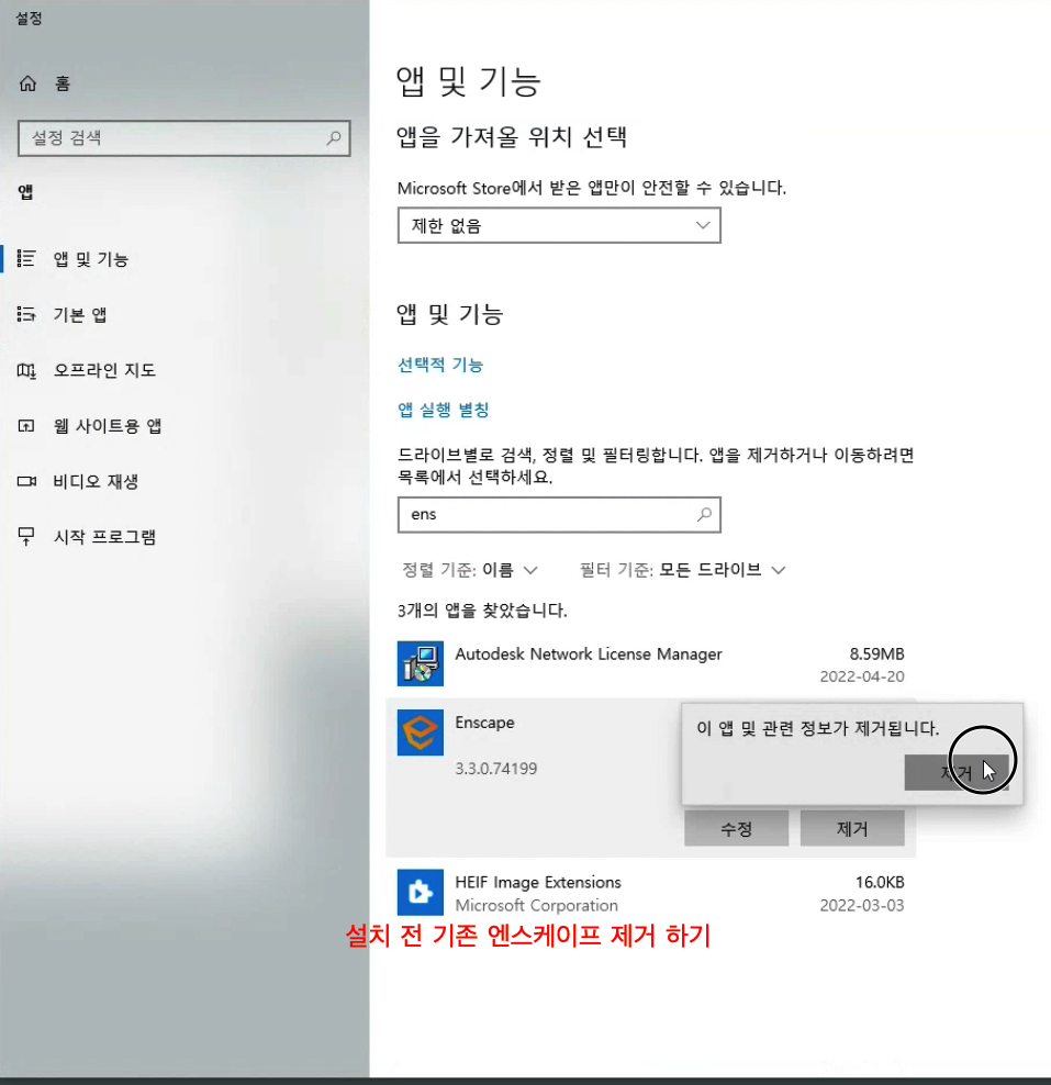 기존에 설치된 에스케이프를 삭제 합니다.
