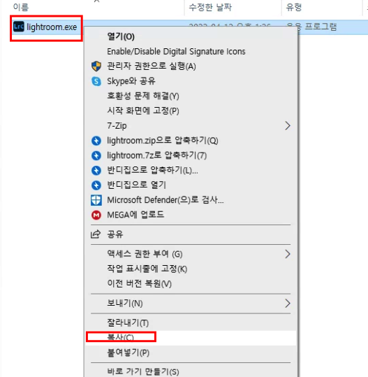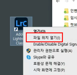 바탕화면에 라이트룸 아이콘 > 오른쪽키 > 파일 위치 열기