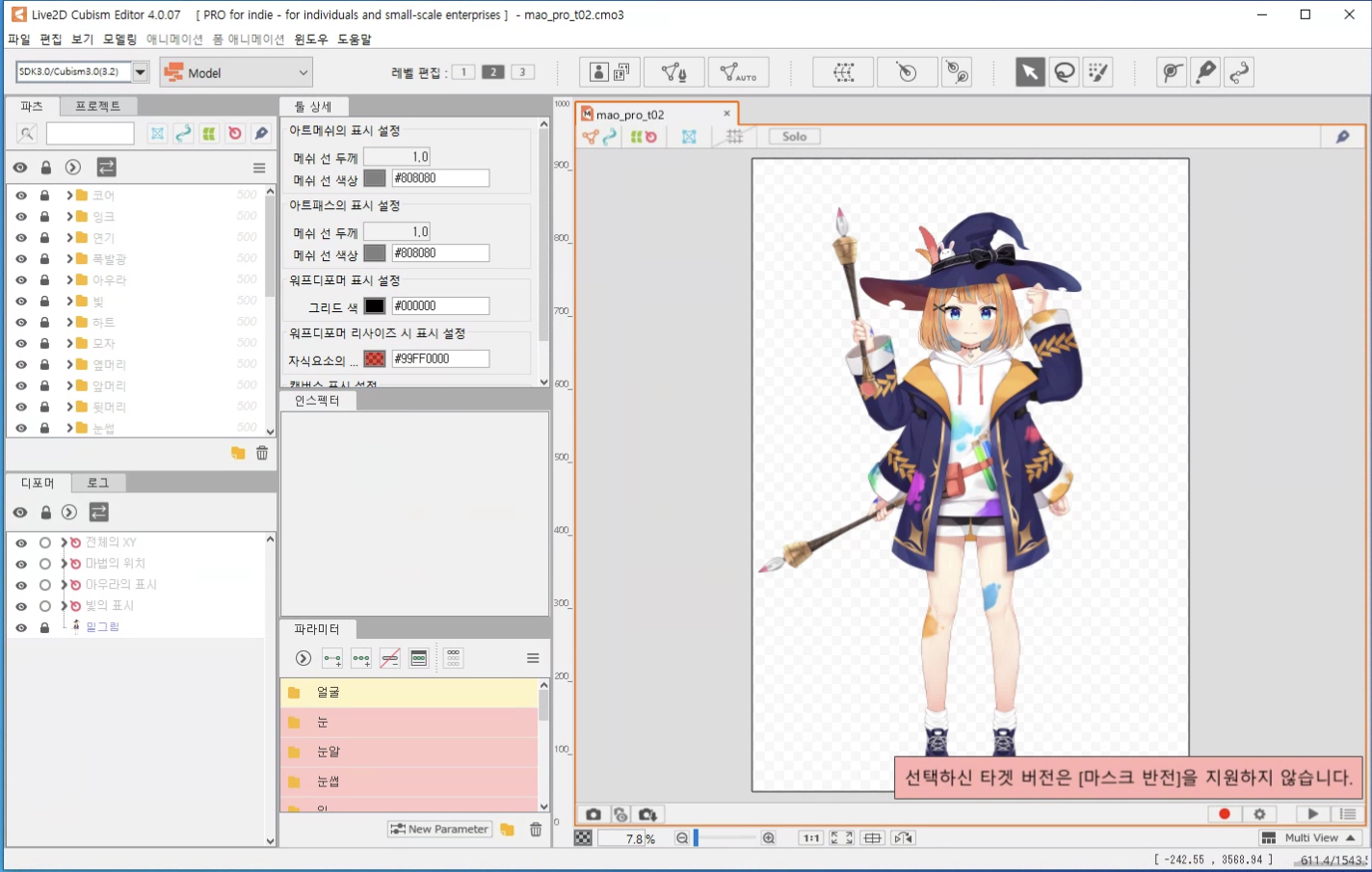 원화를 PSD 데이터 내에서 파트별로 레이어를 구분해 저장하면, Cubism Editor 내에 레이어명과 표시 순서가 적용된 상태로 가져올 수 있습니다.