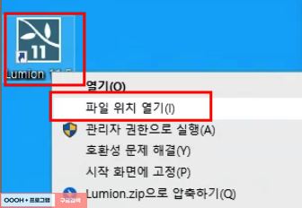 바탕화면으로 이동하여 새로 설치된 루미온 아이콘에서 오른쪽키를 누르고