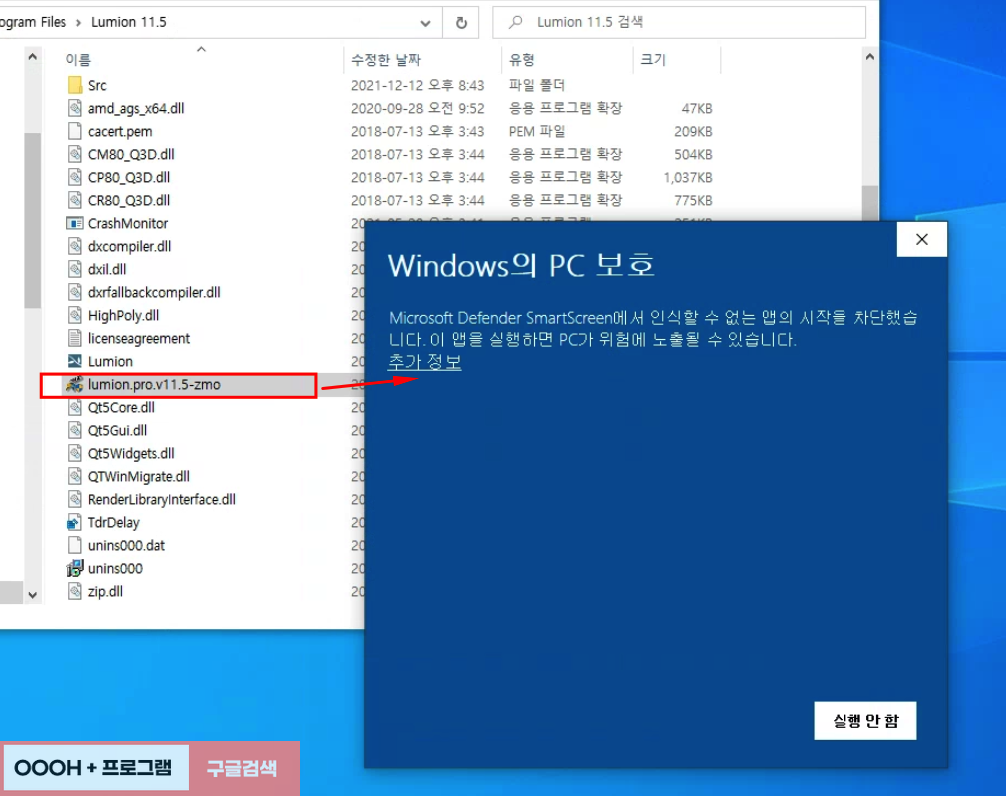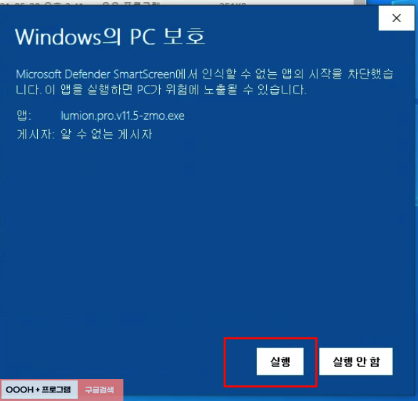 실행하면 윈도우즈 보호 관련 문구가 나온는데 [추가 정보] 를 누르고 강제 실행합니다.