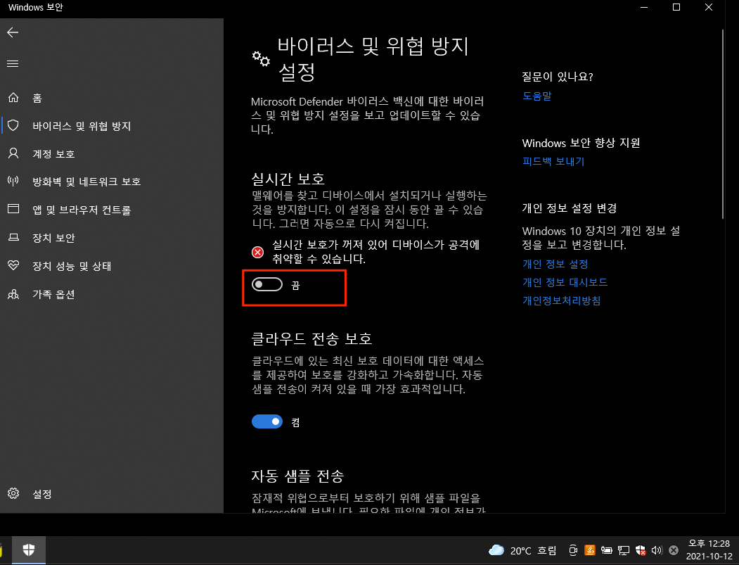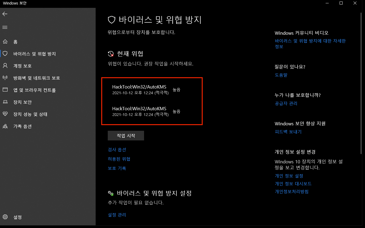 오피스 정품인증 크랙이 끄나고나서 다시 실시간 보호를 활성화 하면 됩니다.