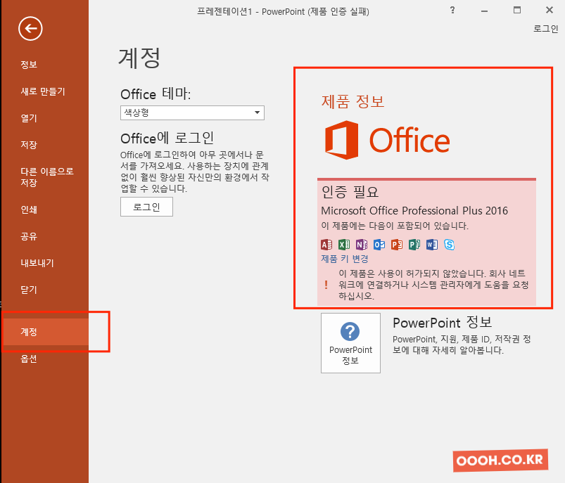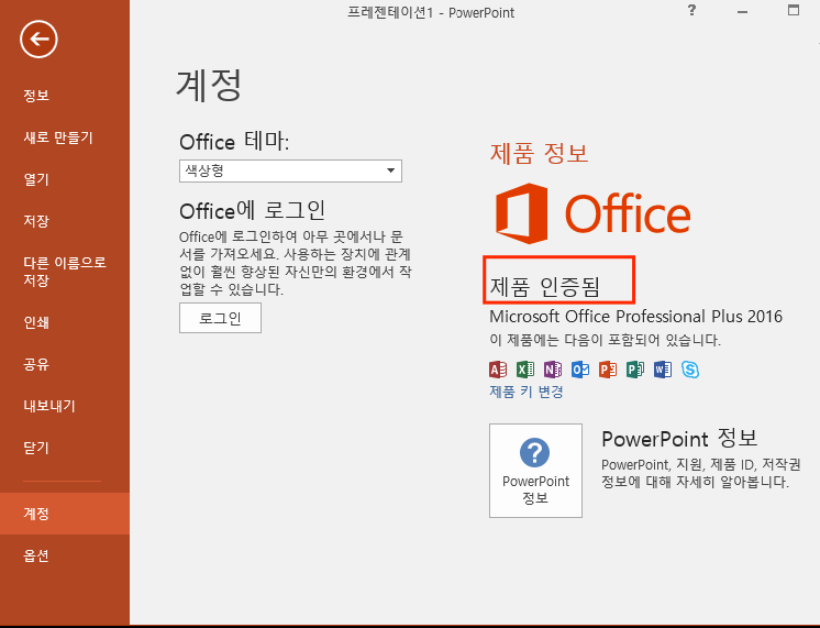 오피스에서 파일 >계정 을 누르시면 정품 인증 여부가 나옵니다.