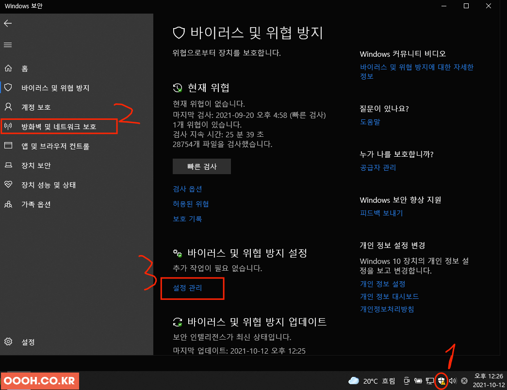 우측 하단에 방패모양 > Windows보안 화면 > 방화벽 및 네트워크 보호 > 설정관리