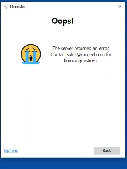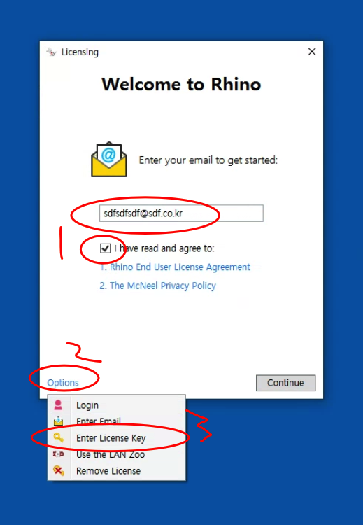 ▼설치되면 이메일 작성과 체크박스 체크하고 options을 누른다.