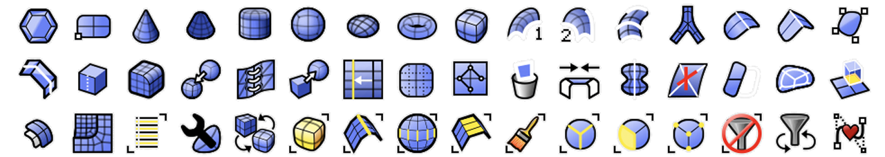 서피스: 제어점, 핸들막대, 차수 변경, 매듭점 추가/제거, 일치, 연장, 병합, 결합, 트림 해제, 아이소팜 기준으로 서피스 분할, 재생성, 축소, 주기화, 부울 연산 (합집합, 차집합, 교집합), 전개 가능한 서피스 펼치기, 서피스상의 커브를 따라 배열.
