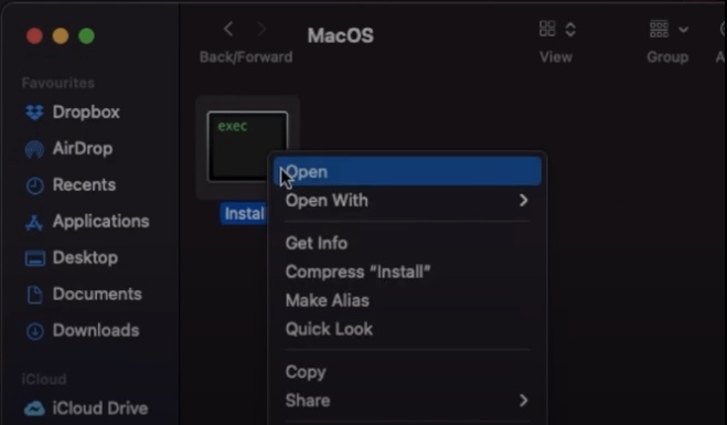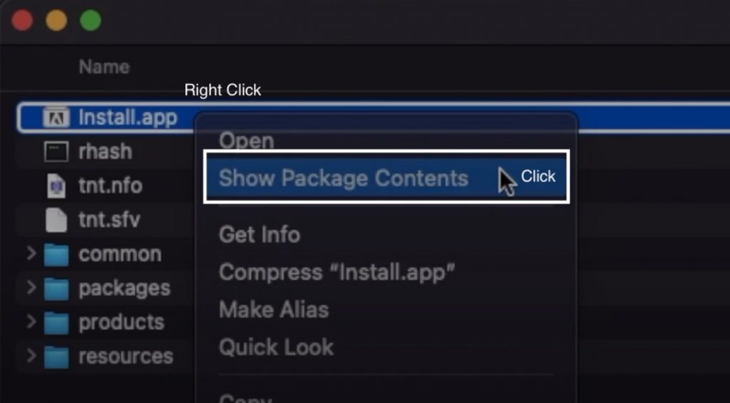 이제 위 그림과 같이 Install.php 파일을 마우스 오른쪽 버튼으로 클릭하고 '패키지 내용 표시'를 선택합니다. '콘텐츠'라는 폴더가 열립니다. 이제 Mac OS 폴더로 이동하여 엽니다. 설치(터미널 명령)를 두 번 클릭하면 암호를 묻고 암호를 입력합니다.