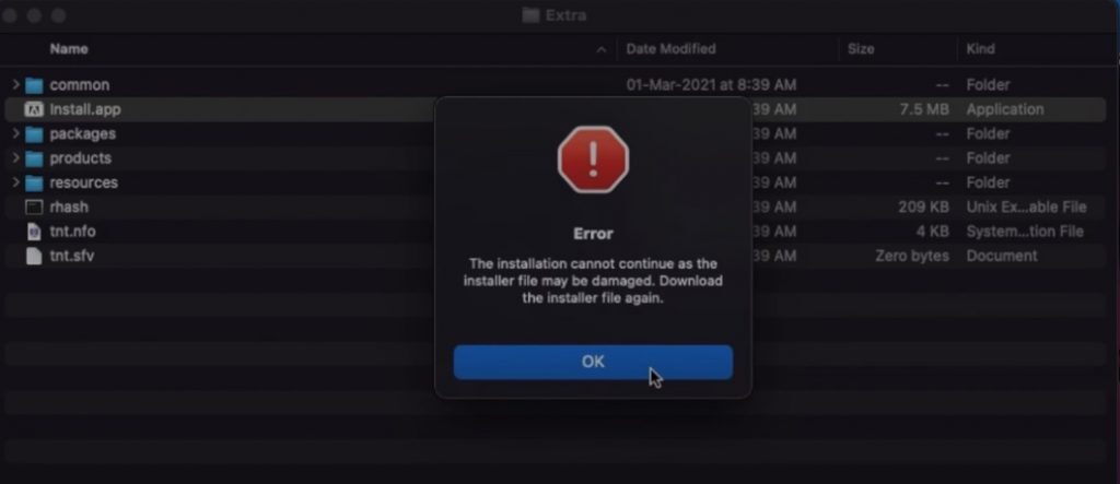 The Installation cannot continue as the installer file may be damaged. Download the installer file again.