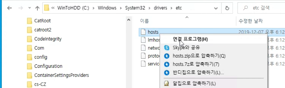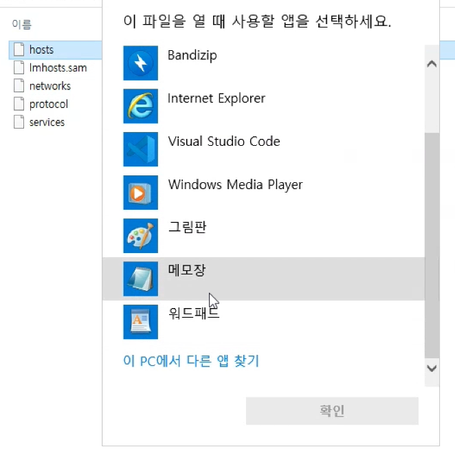 hosts파일을 찾은 후 마우스 오른쪽키 > 연결 프로그램을 클릭합니다.
