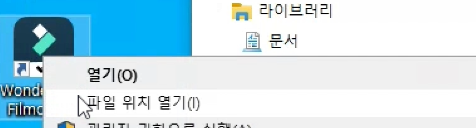 바탕화면에 필모라 아이콘 > 오른쪽키 > 파일 위치열기