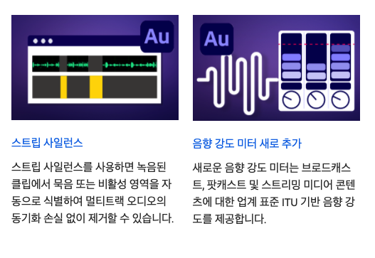 쿨 에디트에서부터 이어져 온 잡음 제거 기능이 상당한 강점이다. 예를 들어서, 다른 소프트웨어는 무음이어야 할 부분에 나오는 소리만을 없애는데 그치는 반면, 어도비 오디션은 잡음의 주파수를 분석하여 음원 전체에 숨어있는 모든 잡음을 지워버릴 수가 있다. 이게 큰 장점이었는데... 잡음 제거 플러그인으로 Izotope사의 RX시리즈가 따로 존재하고, 이게 압도적으로 성능이 좋다.