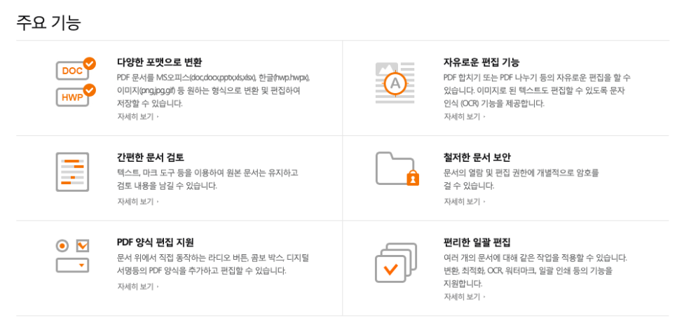 PDF 합치기 또는 PDF 나누기 등의 자유로운 편집을 할 수 있습니다. 이미지로 된 텍스트도 편집할 수 있도록 문자 인식 (OCR) 기능을 제공합니다.