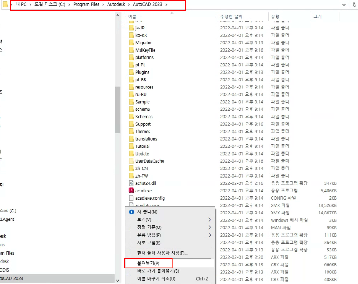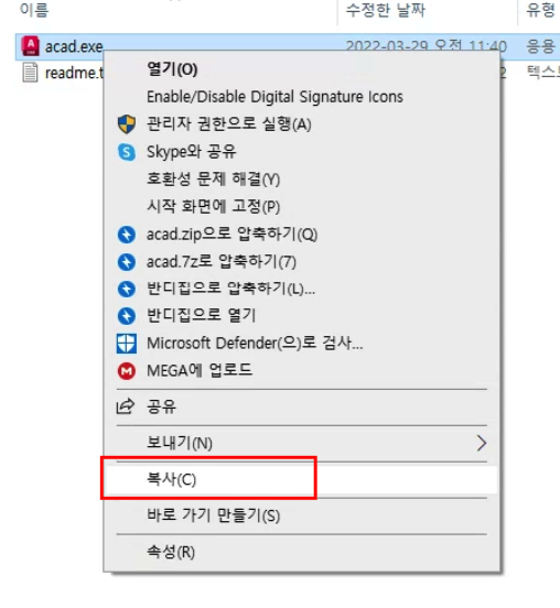 acad.exe를 복사해서 설치된 폴더에 붙여넣어야 한다.