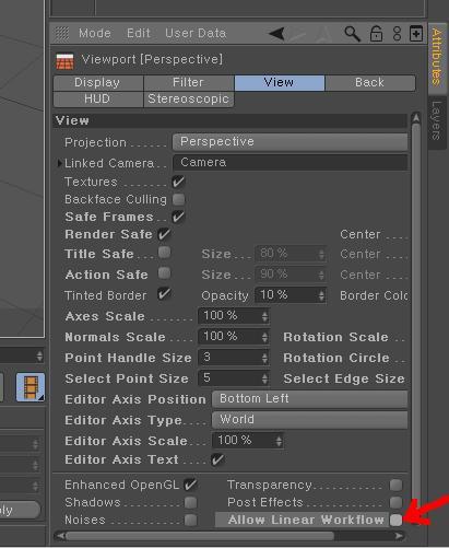 그리고 속성창을 보면 view 탭에서 > Allow Linear Workflow 체크해제.
