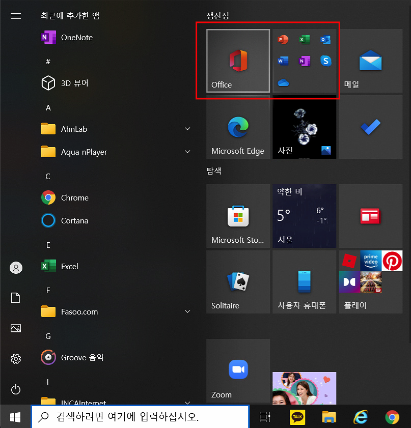 시작버튼을 눌러서 우측 상단에 아래와 같은 Office가 있는지 확인합니다.