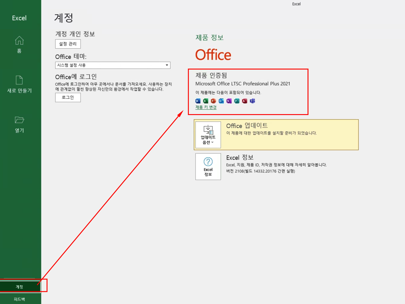 오류3. 오피스 계정메뉴에서 정품확인을 했는데 버젼이 2016이나 다른 버젼으로 뜹니다.
