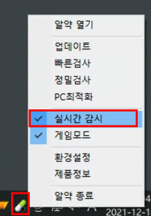 오른쪽 하단 툴바에서 알약 > 마우스 오른쪽키 > 실시감 감시 클릭