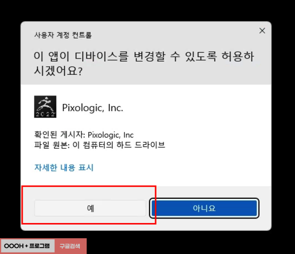 사용자 계정 컨트롤 안내가 나올경우 예를 눌러줍니다.